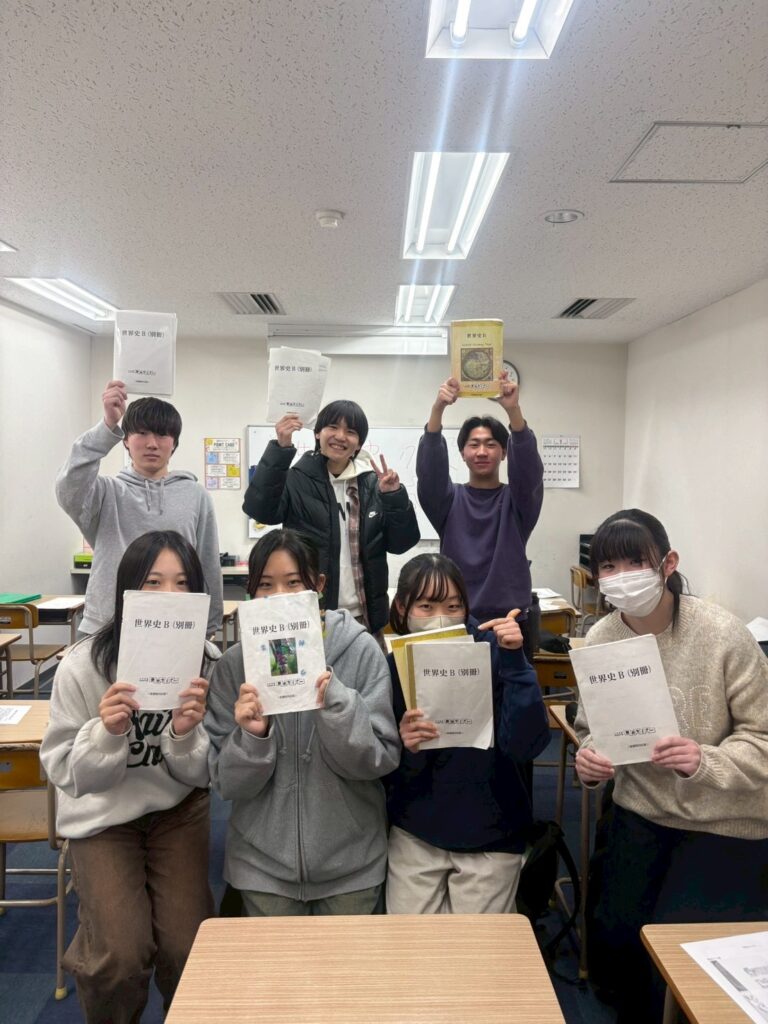 写真は、日本史・世界史の教科書を手にした受験生たちの様子です。これまで一緒に読み込んできた藤井セミナーオリジナルテキスト『日本史』『世界史』を掲げて、ラスト授業を締めくくりました。