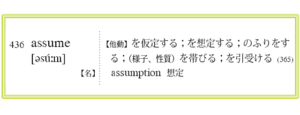 例えば、 assume なら、想定する、帯びる、装う、引き受ける…とたくさんの意味があります。でも、最初は英単語1つに、日本語1つの暗記でOKです。